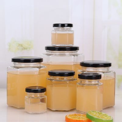 Χονδρικά Hexagon μπουκάλια αποθήκευσης γυαλιού καρυδιών τουρσιών σάλτσας τσίλι μαρμελάδας μεταλλικών κουτιών πολυγώνων με Lug το καπάκι